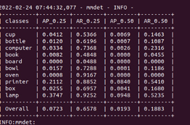 학습이 잘 진행되는 모습이네요. 저는 처음은 SUNRGBD 대표 데이터인 책상, 침대, 테이블 등 10가지 클래스에 대해서 학습 시켜보았고 그결과는 논문과 거의 일치하는 값이 나왔습니다. 그런데 저는 사과를 학습시킬 것이기 때문에 작은 물체에 대한 Precision값이 중요했습니다. 그래서 작은 물체들을 10개 뽑아서 돌려보았는데요. 결과는 다음과 같습니다.