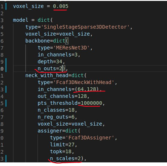 - 모델에서 4단계를 거치지말고 2단계만 거치도록 구조를 변화시킵니다. 즉, 작은영역에서만 detection을 진행하도록 하고 시스템부담이 줄어든 대신 voxel_size를 반으로 줄여서 더 자세하게 detection합니다.