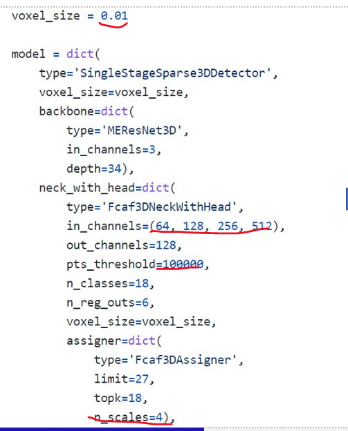 빨간색 밑줄친 부분위주로 보시면 복셀사이즈는 반으로 줄었고 in_channels은 4개에서 2개로 구조를 변경하였습니다.