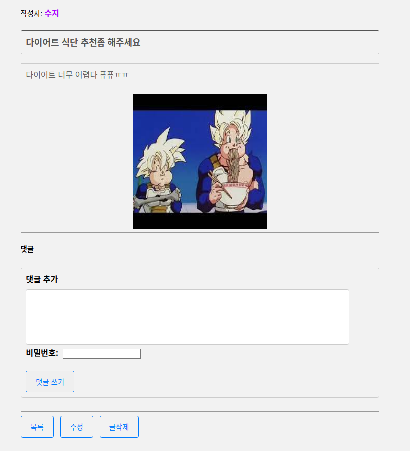 글에 대한 댓글을 쓸수 있으며 비밀번호를 설정하고 나중에 댓글을 삭제할때 비밀번호를 입력해서 삭제할수 있습니다.