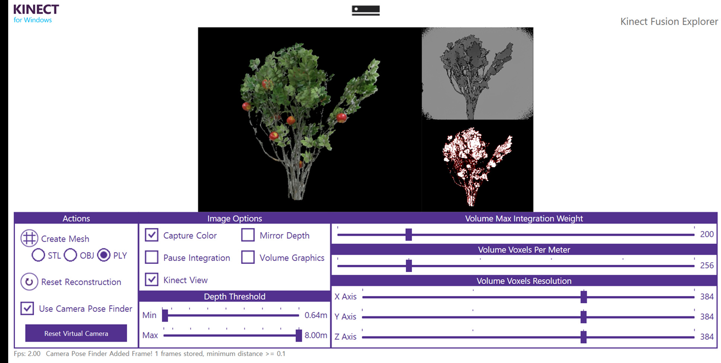 Kinect V2 센서의 사진과 스펙 그리고 사과 pointcloud 데이터를 작업하는 모습입니다.