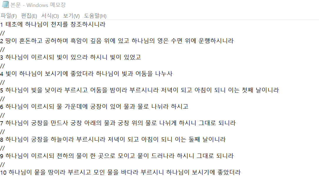 os.chdir("C:\\users\\youraddress\\desktop\\성경") # 성경파일 위치