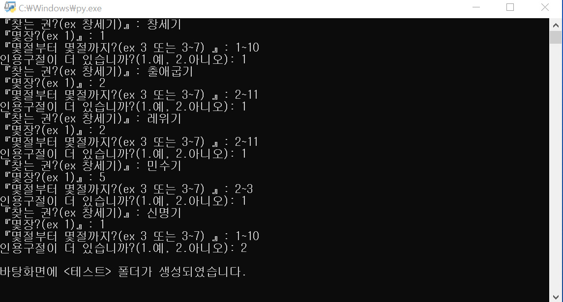 print("해당 성경을 찾을수없습니다(띄어쓰기 X), 다시 입력해주세요\n")