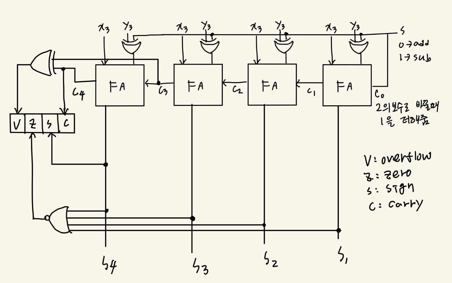 -오버플로우(V)가 발생시 계산 불가(MSB 기준 Cin ⊕ Cout = 1이면 오버플로우(V) 발생)